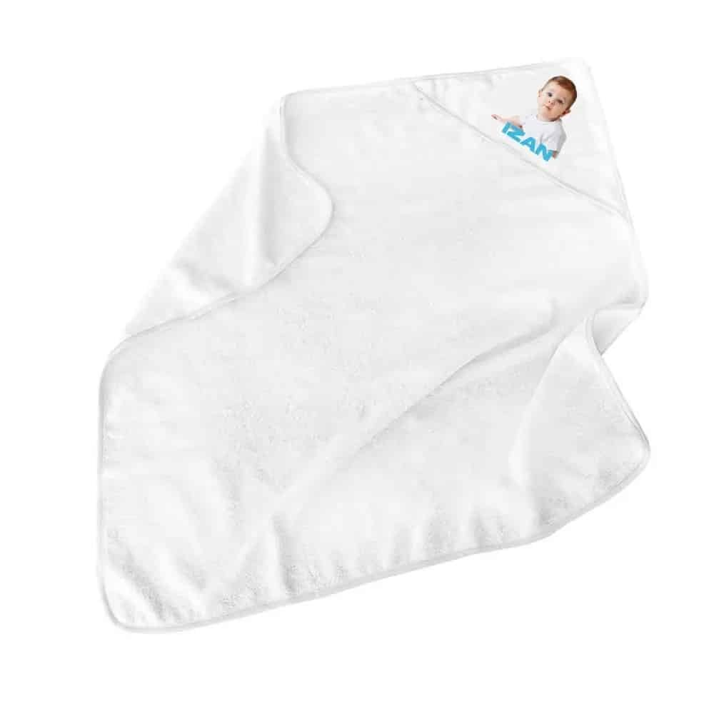 Toalla personalizada con fotos con capucha para bebé: Una toalla suave y absorbente con capucha, perfecta para secar al bebé después del baño. Personalizable con fotos para un toque único y especial. Ideal para regalar o para uso personal.